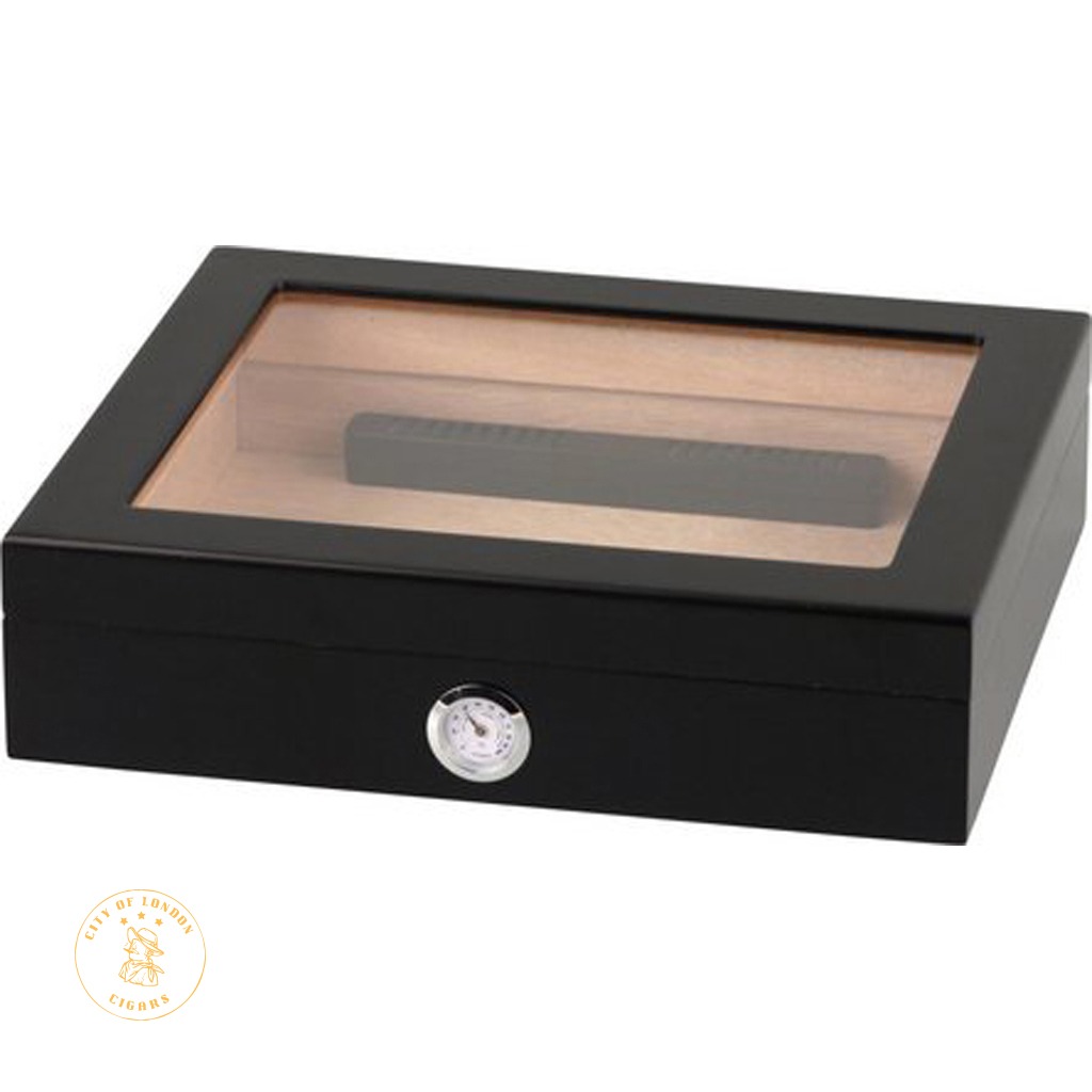 Keep your cigars fresh and organized with this sleek Black Humidor, designed to hold up to 20 cigars. Featuring a clear glass window, it allows you to easily view your collection while maintaining the perfect humidity level with its built-in humidification system.