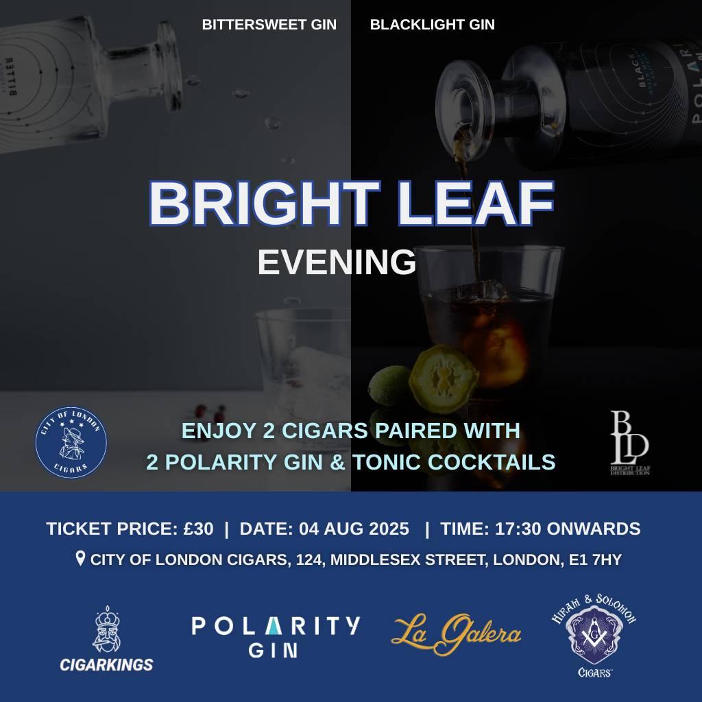 Join us for Bright Leaf Evening, an exclusive night of fine cigars, premium gin, and unparalleled company at City of London Cigars.