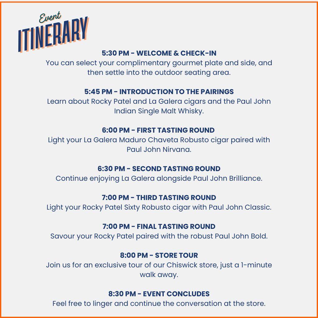 Each guest will enjoy two premium cigars: the Rocky Patel Sixty Robusto and La Galera Maduro Chaveta Robusto, paired with four rounds of Paul John Indian Single Malt Whisky, thoughtfully selected to enhance the tasting experience.