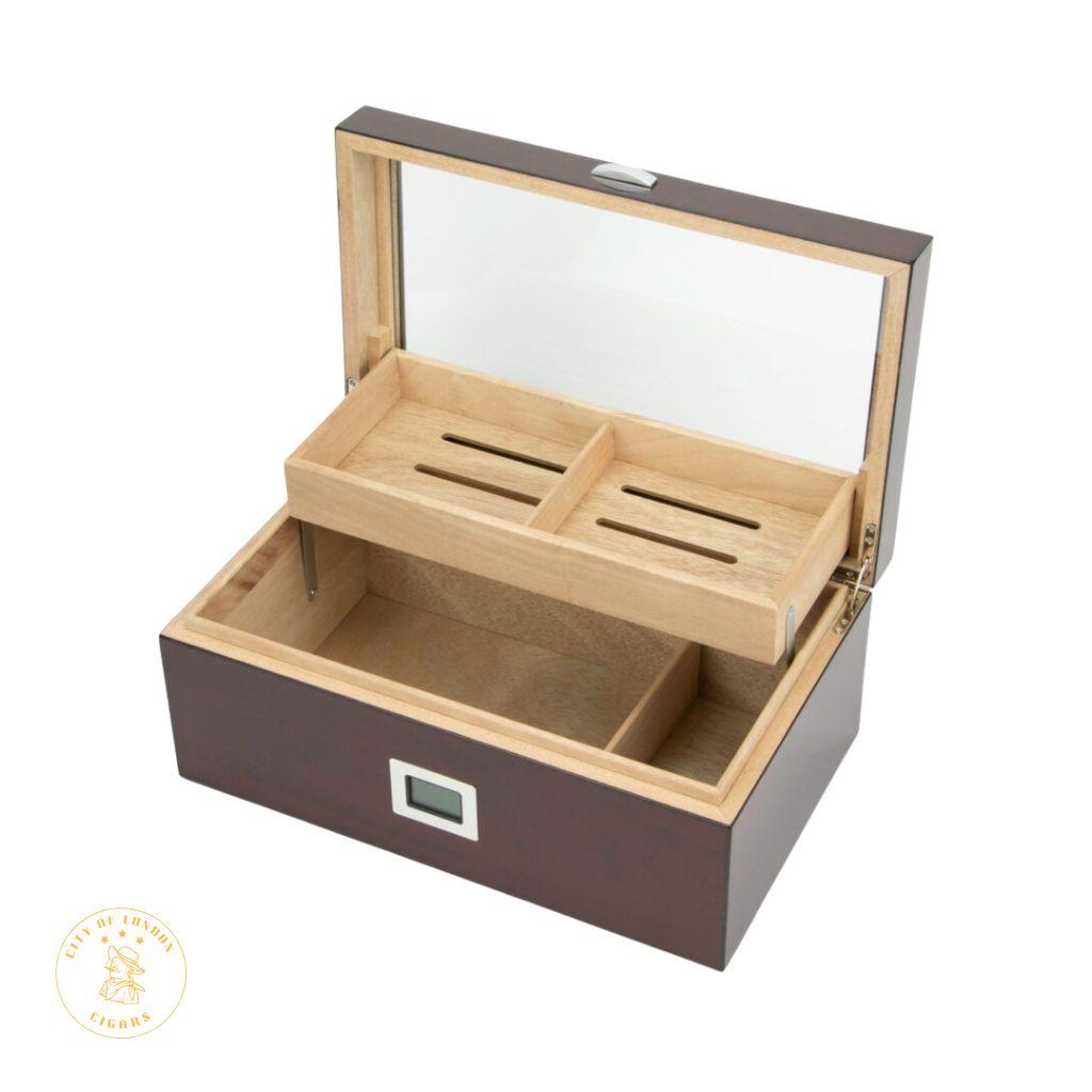 About 75 cigars can fit inside the sophisticated glass-lidded Cherry Finish Hi-gloss humidor. The Cherry Finish humidor appears extremely high-quality due to the well-crafted veneer. The fold-out tray, which rises automatically when the humidor is opened, is a unique feature. Two dividersone for the top and a larger one for the bottomas well as a digital hygrometer are included.