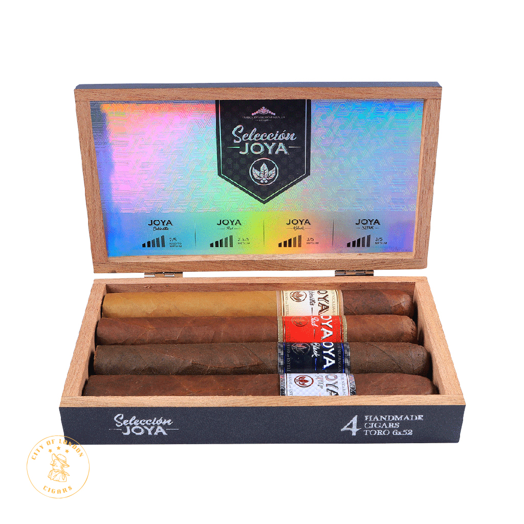 Seleccion Toro is the opportunity to try all four cigars in the JOYA family in a stylish gift box thatreflects the modern line up. JOYA Cabinetta Wrapper: Ecuadorian Connecticut, Nicaraguan Habano Criollo (TIP), Binder: Nicaragua Filler: Nicaragua Strength: Mild to Medium Bodied Profile: Creamy with Peppery Notes JOYA Red Wrapper: Nicaragua Habana Criollo (Claro, Binder: Nicaragua, Filler: Nicaragua (Jalapa, Condega & Estel) Strength: Medium Bodied Profile: Spicy and Robust JOYA Black Wrapper: Mexican San Andres, Binder: Nicaragua, Filler: Nicaragua Strength: Medium Bodied Profile: A balanced, rich and pleasant smoking experience JOYA Silver
