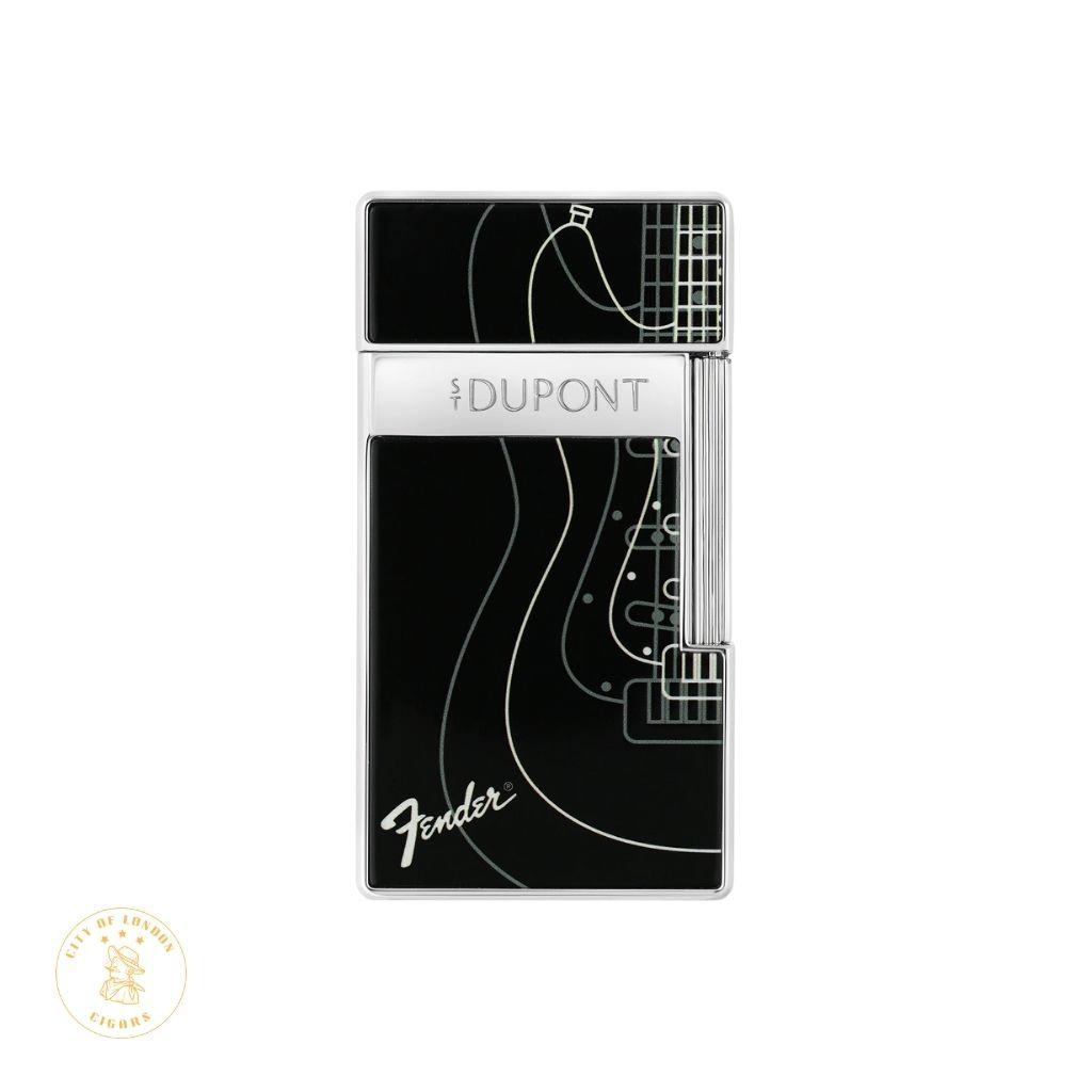 A bold creation born from the collaboration between S.T. Dupont and Fender, this lighter blends the Maisons expertise with the spirit of rock. The iconic silhouette of the Stratocaster is set against a deep black lacquer finish, accented with refined silver details. Equipped with a strong 2 cm blue torch flame and an adjustable setting, the Biggy Fender lighter is designed to deliver both performance and style. Details: Dimensions: 73 39 13.60 mm Weight: 98.5 g Material: Brass / Zamak Torch flame: 2 cm (adjustable) Refillable with S.T. Dupont gas (sold separately) Delivered empty, photos non-contractual