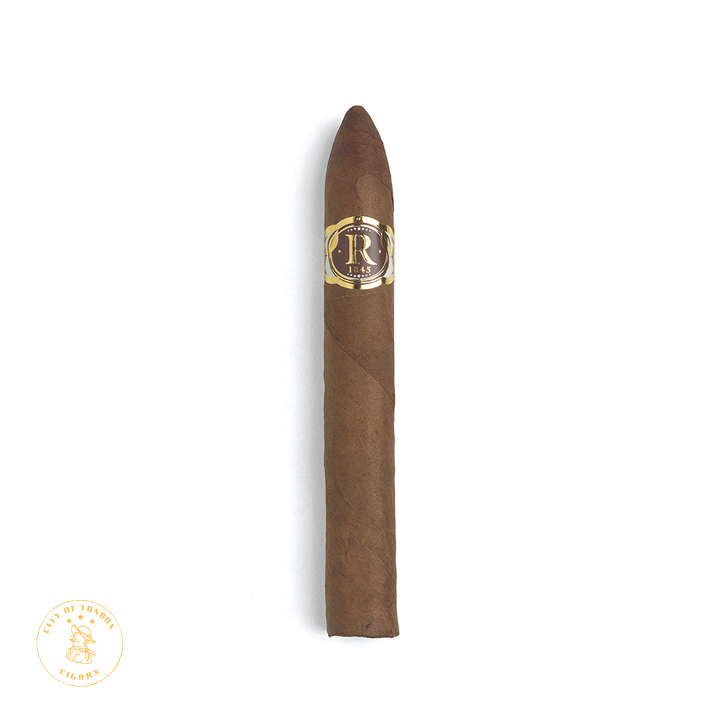 The Robaina family has been cultivating tobacco on its valuable vegas (fields) at Cuchillas de Barbacoa, which is located in the San Luis sector of the Vuelta Abajo tobacco zone, since 1845. Vegas Robaina's medium-to-full-flavor vitolas are all "tripa larga, totalmente a mano"long filler that is entirely handmade. This piramide or torpedo is the best shape for delivering the medium-to-full combination of richness found in Vegas Robaina. An homage to all of Vuelta Abajo's farmers. This cigar has a somewhat blistering burn and is made with a blunted belicoso tip. Though a raw vegetal note emerges in the end, nutmeg, cinnamon, and maple candy compliment its natural nuttiness. Details: Strength : 4/5 Origin: Cuba Length: 6 1/8 " Ring Gauge: 52