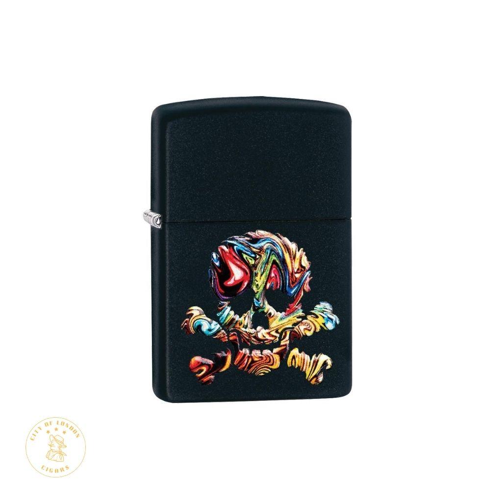 This website contains products and content intended for individuals over 18, including tobacco products. To continue, please confirm your age. By using this website, you confirm that you are of legal smoking age in your location. If you are not, please leave the website immediately.his model features a vibrant skull on a black matte finisha bold statement piece presented in a gift box. Features: Genuine Zippo windproof lighter with the unmistakable Zippo "click" Comes packaged in a gift box Refillable for a lifetime of use; recommended use with genuine Zippo premium fuel, flint, and wicks Skull artwork on black matte finish Durable windproof construction
